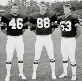 In UNH football, it's not often that members of the defense team psych out opponents by speaking Russian. But for the Jarostchuk brothers, who played Wildcat football in the late '80s, a comment like "Ya vozmu sorok shest—A ti vozmi tritsatz dva!" (I'll take 46—you take 32!) while waiting for the snap was a fun way to unnerve the opposition. Ilia Jarostchuk '87 was the first brother to be offered a football scholarship, and to arrive at UNH, where he majored in civil engineering. His mother was anxious about his playing college football. "She saw these enormous guys in the weight room and told my father, 'If you send our son here, his blood is on your hands,'" he recalls. Her attitude changed with time, however. A nearly constant presence at every game, "She would yell along with the crowd, 'Hit him again! Hit him again! Harder! Harder!'" Ilia says. Basil Jarostchuk '89 followed his brother to Wildcat country, majoring in Russian, and then Alex Jarostchuk '89. Alex, 6'5" and more experienced on the football field, was courted by many schools—Syracuse even sent a recruiter to Durham to seek Ilia and Basil's blessing. In the end, it was academics, not athletics, that lured him to UNH. "The UNH athletic department always supported the academics first. That was one of the biggest factors," says Alex, a chemical engineering major. A sister, Anya, arrived at UNH in 1987 but stayed for just a year. By then, sportswriters had dubbed the three brothers "the Russian Front." "She had to leave because she couldn't get a date," jokes Ilia. "Who wants to confront the Russian Front?"