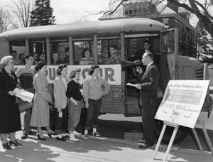 A Tour for Goffstown High In the 1952 photo in the Spring 2011 issue advertising "Free Guided Bus Tours" of the UNH campus are students from Goffstown High School. I am standing outside the bus, the second student from the right, with blonde hair and wearing a black sweater and white sneakers. Directly behind me is Sylvia Jennings, later the wife of Frederick Jennings '54 of AGR fraternity.