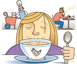 It may sound like an old wives' tale, but what's more soothing than a steaming hot bowl of chicken soup when you're sick? No one can explain exactly why chicken soup is such good medicine—some researchers believe it's the steam that opens up congested noses and throats. Others talk about the broth, or the vegetables and there's even a theory about amino acids. But Connie Hutchins, a part-time administrative assistant at UNH Health Services, has a simpler, more wholesome theory: She believes it's the comfort factor. "I grew up on chicken soup," says Hutchins. "If you were sick with a fever or the flu, you got crackers and chicken soup. It always made you feel better." About five years ago, Hutchins—nicknamed the "Soup Lady" by her co-workers—brought this healing philosophy to work when she began donating her homemade chicken soup to students and staff to help ease their suffering. "I started making the soup during a terrible flu season. The staff was hit particularly hard and I just asked, 'Do you mind if I make some chicken soup for everybody?' And that's how it started." While at first Hutchins supplied the soup herself, soon her colleagues were helping with the cost. Eventually she received a $700 grant from the Parents' Association to cover the cost of the ingredients, a crock pot, a wagon and other supplies. She estimates that she serves from 50 to 100 gallons of soup per season. The mother of two and a life-long volunteer for various organizations such as Children's Hospital in Dover, N.H., it's not surprising to hear Hutchins say that the best part of being the "Soup Lady" is her interaction with students. "I sit at the front desk so I get to watch everyone enjoying my soup. I remember one young woman who came into the center looking very sad," she recalled. "A little later, she came up to me and said, 'I know this sounds like a silly question, but who made this soup? I love it!" That, says the Soup Lady, is what makes her work so worthwhile. Easy to print version blog comments powered by Disqus |