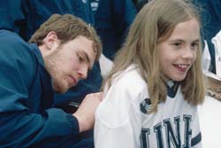 Walls reminded them how they had sent a card, stuffed animal and signed jersey to a friend of hers, UNH sophomore Amy Niepokoyczycki, who was hospitalized for lymphatic cancer treatment. Niepokoyczycki, a dancer and hockey fan with a crush on forward Lanny Gare, was deeply touched, Walls wrote. When Niepokoyczycki died, the entire team showed up as a sign of respect at a celebration of her life. That day, wrote Walls, she learned a lesson that guides her today: While all of your on-ice efforts have greatly impressed me, it is your poise, dignity and generosity off the ice that set you apart. Thank you... for creating an athletic environment where caring and compassion for teammates and the community are as valued as running the right defense and offense. Such strong feelings about UNH hockey are common in the Wildcat nation. Marty Scarano, UNH's athletic director, is a former Penn Stater and not one easily bowled over by diehard support. "I am wowed by the level of fan support here," said Scarano, who joined thousands of fans at exuberant rallies before and after the team's Frozen Four games in Buffalo. "The synergy among the alumni, the community and the players is amazing—maybe even unique. It nurtures the program from year to year." In the championship game on April 12, the 'Cats did what they'd done all year: used grit, balance and depth to make up for lack of superstar power. By the end, no one could deny the presence of a new star in goalie Michael Ayers '04, whose performance made the difference in the 3-2 semifinal victory over top-seeded Cornell and was pivotal in the team's ability to tie defending champion Minnesota through two periods. Most of the contest was much closer than the 5-1 score suggested. By 10 p.m., freshly-showered and shaved players filed into the banquet room crowded with fans who would not leave without paying one last tribute to their team. Team captain Patrick Foley '04 returned the compliment, calling the fans "our seventh player." Easy to print version blog comments powered by Disqus |