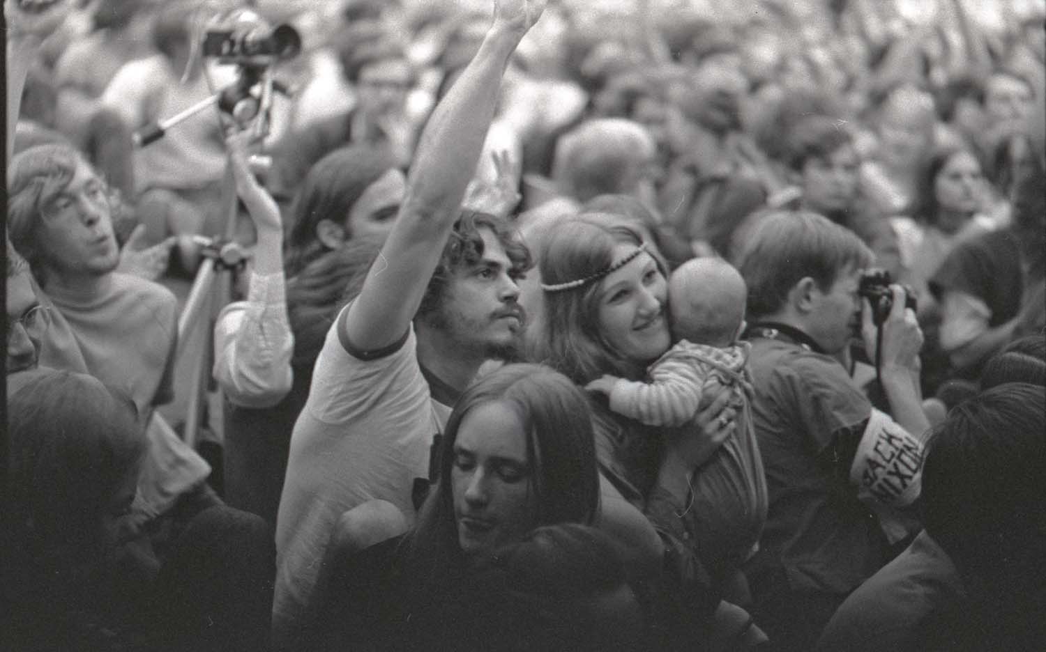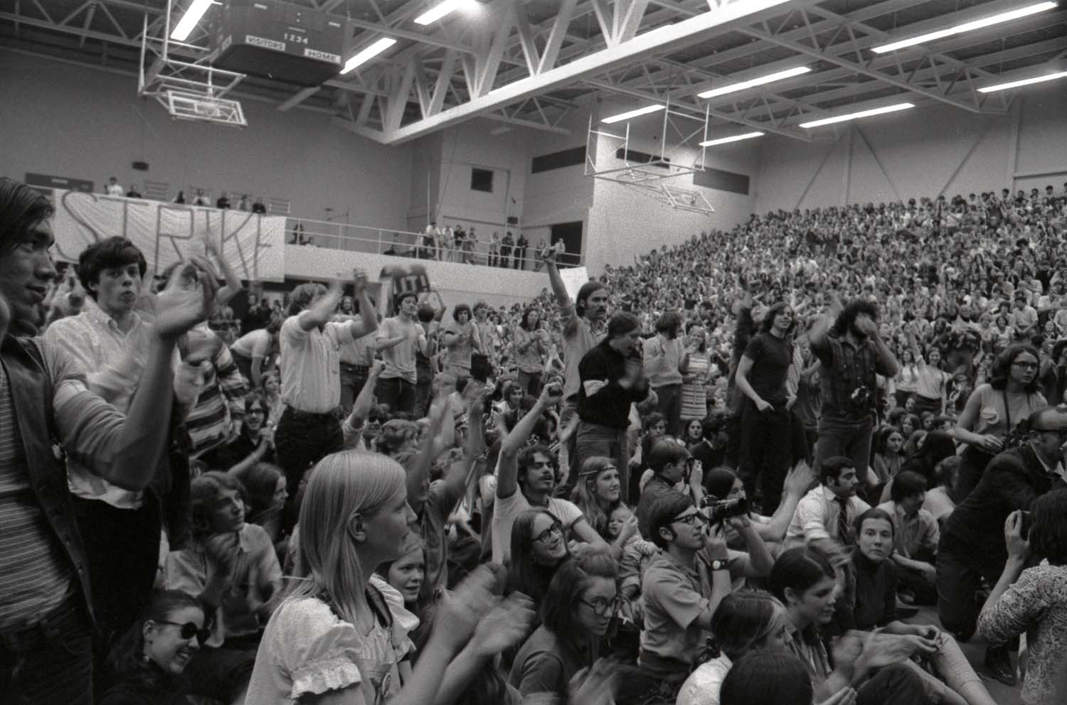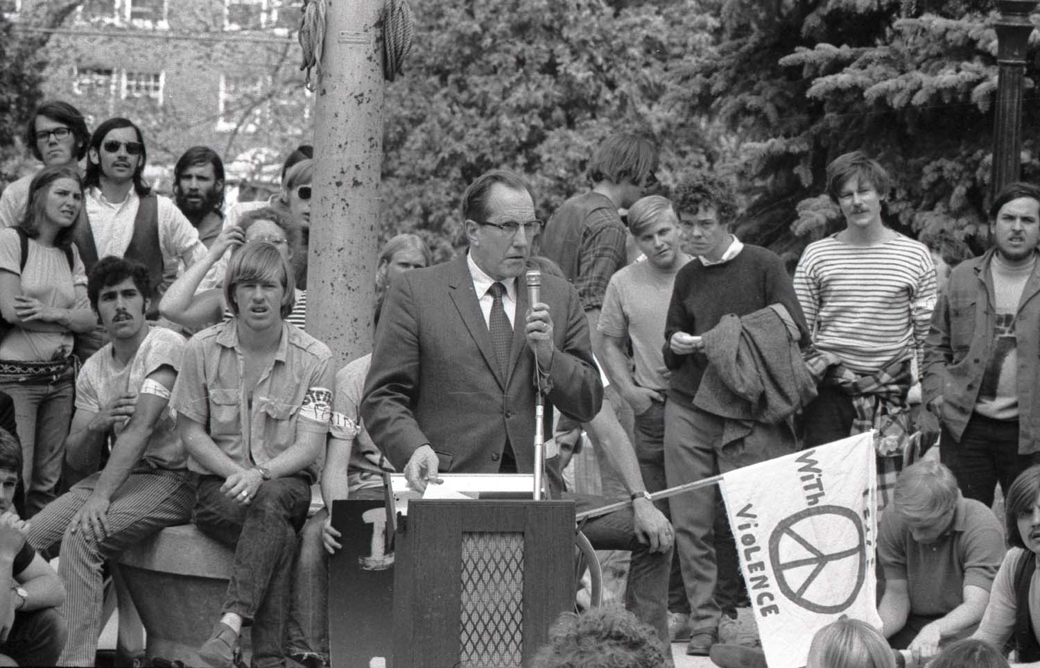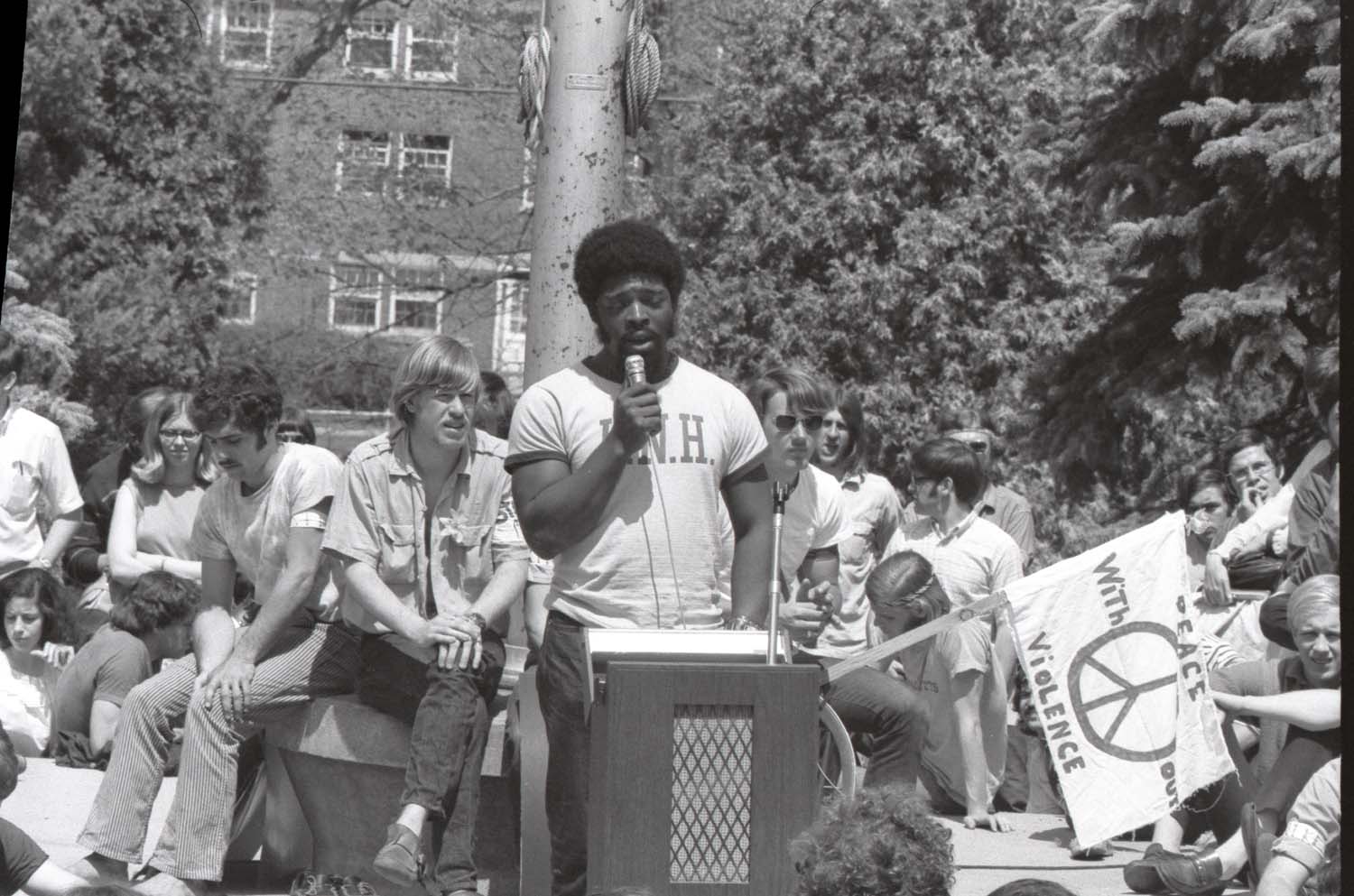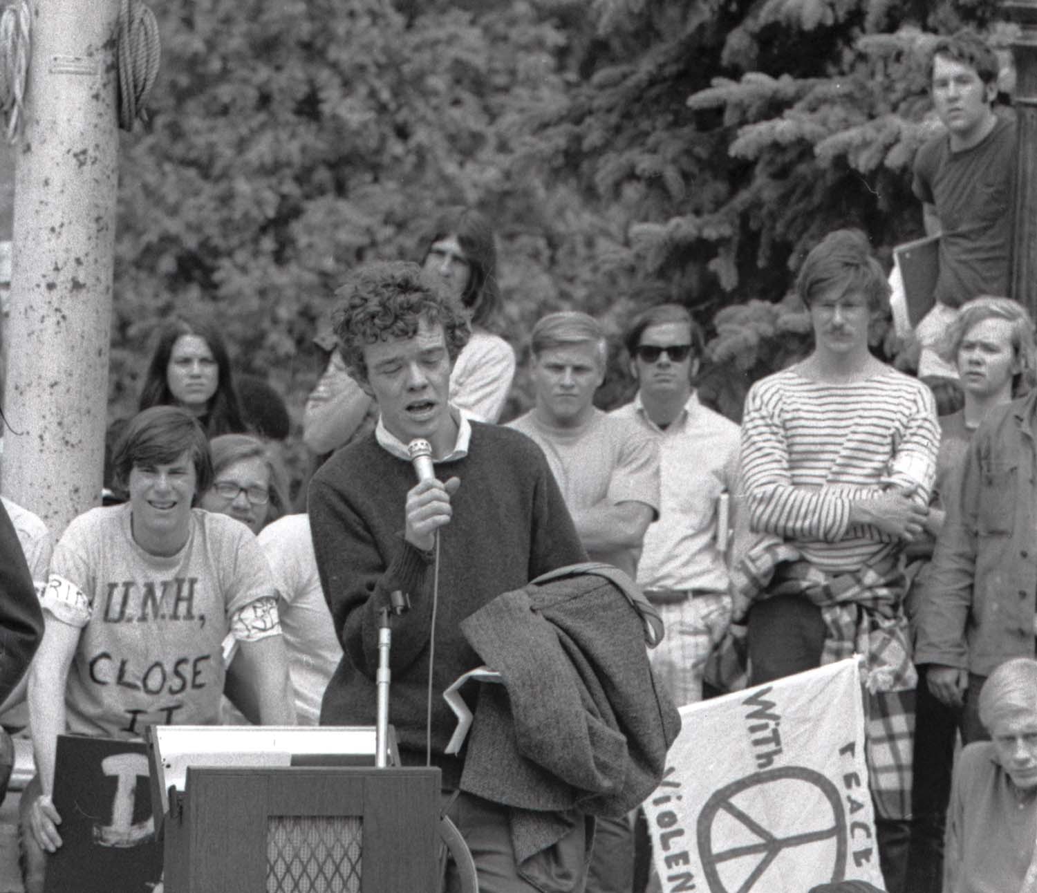 5. President John McConnell at the podium. Curly-haired student (dark crew neck sweater, in front of peace flag next to John McConnell) is Mark Wefers '73, student body president. Click photo for a larger version; e-mail alumni.editor@unh.edu if you recognize anyone else in the photo.