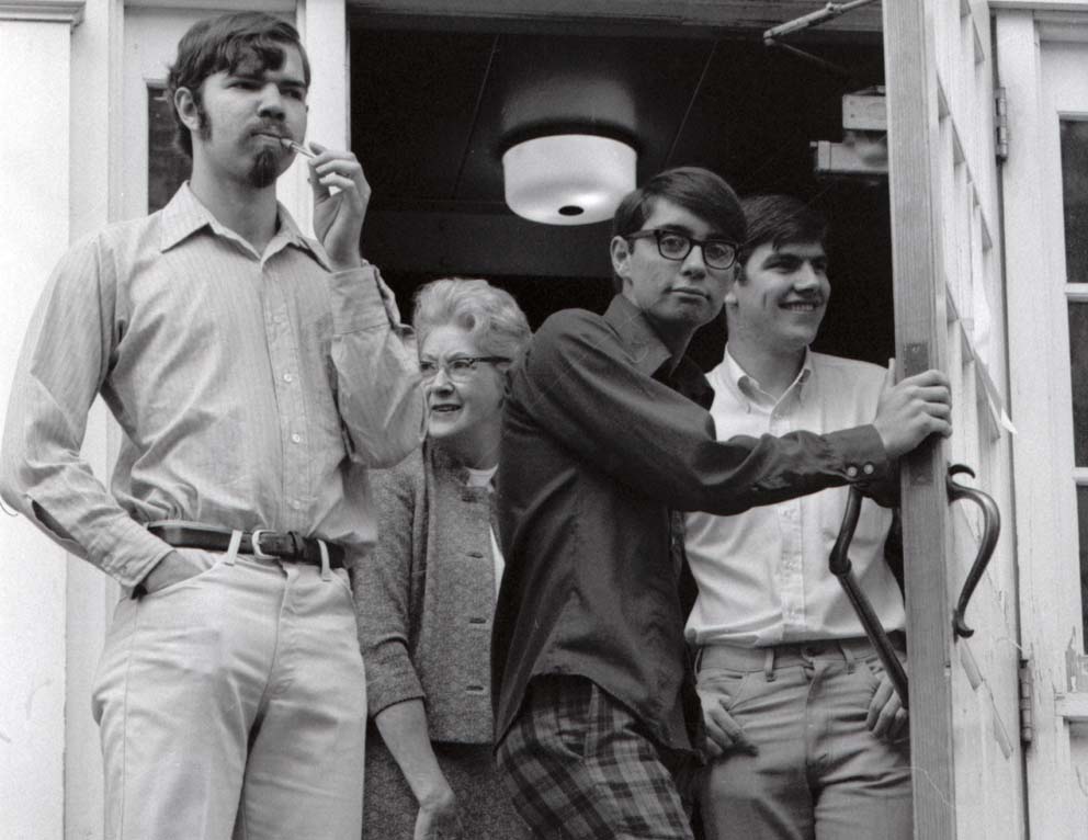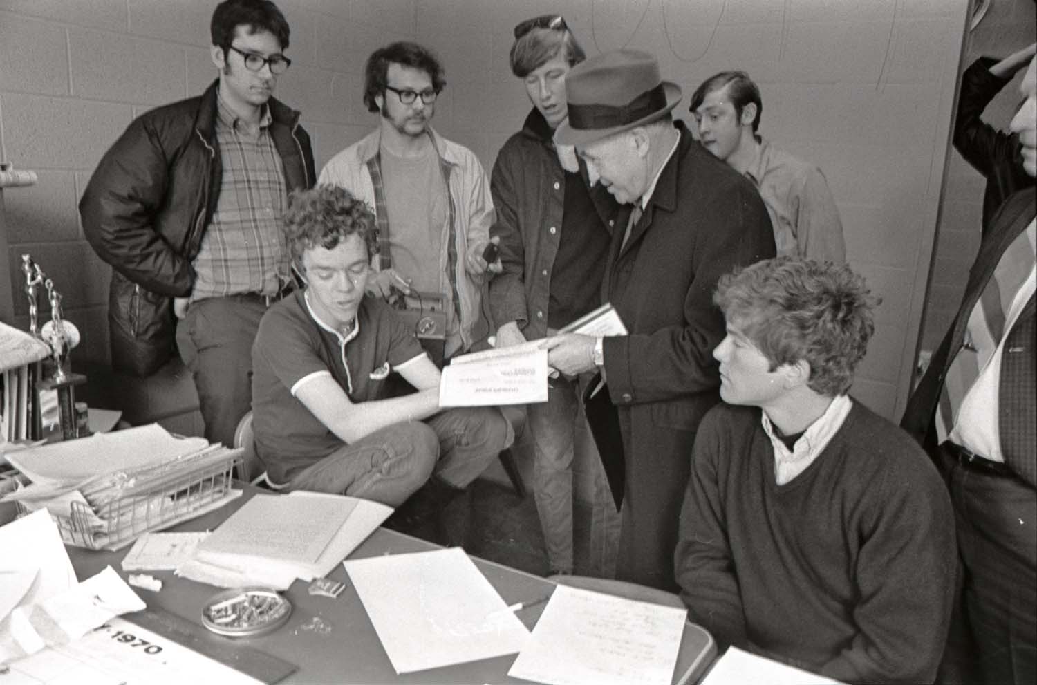 3. U.S. Marshall Victor Cardosi, in hat, serves Mark Wefers '73, seated in the center, a subpoena to appear in court; Wefers hands him a petition signed by more than 2,000 students who asked to be named co-defendants. Students standing in the rear include Dana Gordon '72, second from left. Richard Lewis '70 is seated at right. Student with sunglasses on his head is Pete Riviere '71, then editor of The New Hampshire. Click photo for a larger version; e-mail alumni.editor@unh.edu if you recognize anyone else.