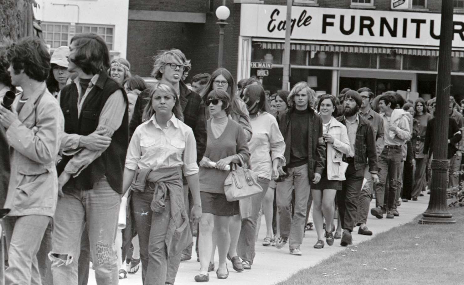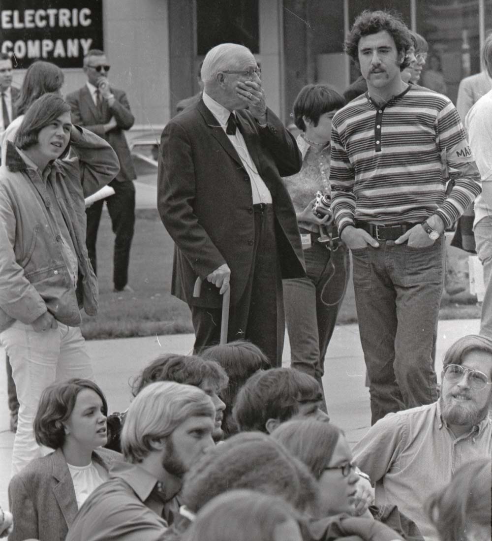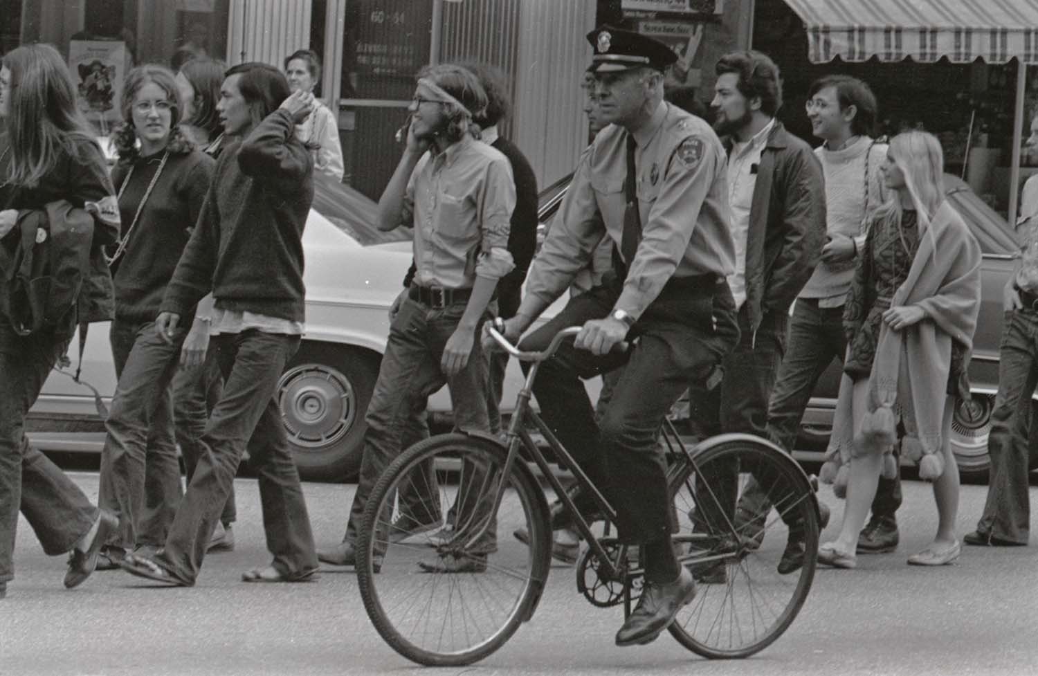 19. Students in Concord for a court hearing for Mark Wefer's trial on criminal contempt of court. Policeman on bicycle is Concord Police Chief Carlson. Woman at far left wearing a necklace is Linda Roberts Williams '74. Click photo for a larger version; e-mail alumni.editor@unh.edu if you recognize anyone else. |