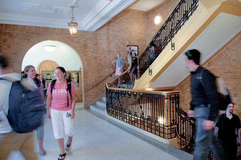James Hall reopened in January after an environmentally friendly renovation. The building now has rooftop water-saving plantings and gray water recycling; an extremely efficient air-handling unit; and an outdoor "classroom" with an original slate chalkboard. Twenty percent of the materials used in the construction were recycled, and 30 percent were extracted or manufactured within 500 miles of Durham. An energy kiosk on the ground floor allows visitors to monitor real-time energy use. While the renovation increased James Hall's size by 14,000 square feet, it refurbished many important architectural features in the 1929 building, including an 1878 wooden geological relief map of the state by Charles Hitchcock that was restored by Wally Bothner, professor emeritus of geology, and the central stairway shown here. UNH is applying for LEED certification for the building; the $33.8 million renovation was supported by the state's KEEP-NH capital improvements initiative. Watch a video about the James Hall renovation and read a story from the Campus Journal. For a print, please contact UNH Photo Services. The image is copyrighted by UNH Magazine, and may only be used with permission. Larger image (copyrighted) blog comments powered by Disqus |