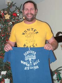 Here is a picture of me in my Hunter Hall T-shirt. And in fact, there were two T-shirts, the "griffin" model ('78-'79) and the "I survived" ('79-'80). I designed them both for the dorm. I graduated from UNH with a degree in environmental conservation. I have taught middle school science for 25 years in Hampton, N.H. I have also coached varsity soccer for 28 years at Sanborn Regional High School in Kingston, and was recently inducted into the New Hampshire Soccer Coaches Association Hall of Fame. My wife, Mary, and I have two children. I have maintained my artwork with a cartoon called "Off Track" in the Carriage Towne News.