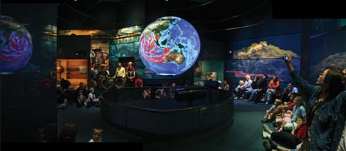 It begins with rubber duckies dropping one by one, like little yellow raindrops, into the ocean. The ducks start coming faster and faster until they vanish into a blur of yellow water sweeping around the globe, which, in this case, is six feet across and hangs from the ceiling of the Smithsonian's new ocean exhibit. Part of a sophisticated computer animation created by Colin Ware of UNH's Center for Coastal and Ocean Mapping (CCOM), the swirling currents of "Science on a Sphere" are designed to educate museum goers about the complexity of ocean waters.