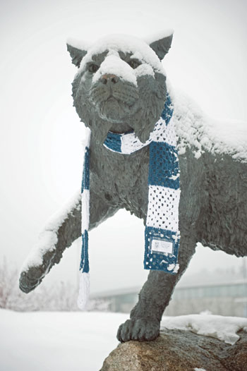 "I watched someone take their friends' picture at the Wildcat statue this morning," wrote Kathy Farmer '11P of Glendale, Calif., soon after the new UNH webcam was launched last fall. "We have that photo, too, of our daughter, Karen!" UNH's first user-controlled webcam, "Cat's Eye," went live in October, offering a 24-hour view of the Wildcat sculpture and adjacent parts of campus, including T-Hall, the Great Lawn, Morrill Hall, Main Street and the Whittemore Center. It was an immediate success—in the four months since it was activated more than 31,000 visitors have used it to view campus. "We're delighted to provide yet another avenue for alumni to stay connected with UNH," says Steve Donovan, executive director of the Alumni Association and associate vice president for UNH Advancement. "It gives alumni and parents a fun way to see campus. There are plenty of reasons to visit Durham, but the webcam makes it easy to make a virtual visit without leaving home." Since the Wildcat sculpture was installed in 2006, it's become a popular location for photos, and students often rub the Wildcat's nose for luck. Viewers can watch lacrosse and field hockey games and practice sessions on the webcam, as well as students walking to classes, the Dairy Bar, the Field House and the recreation center at "the Whitt." Since the Wildcat sculpture was installed in 2006, it's become a popular location for photos, and students often rub the Wildcat's nose for luck. Viewers can watch lacrosse and field hockey games and practice sessions on the webcam, as well as students walking to classes, the Dairy Bar, the Field House and the recreation center at "the Whitt." blog comments powered by Disqus |